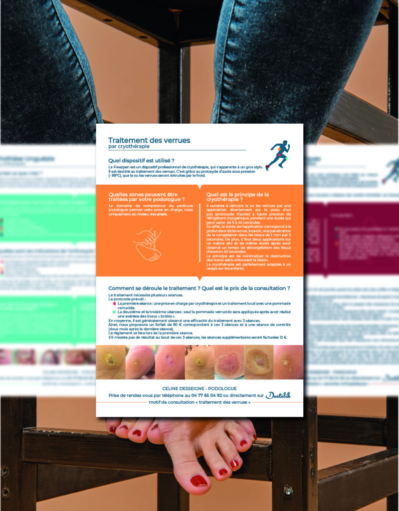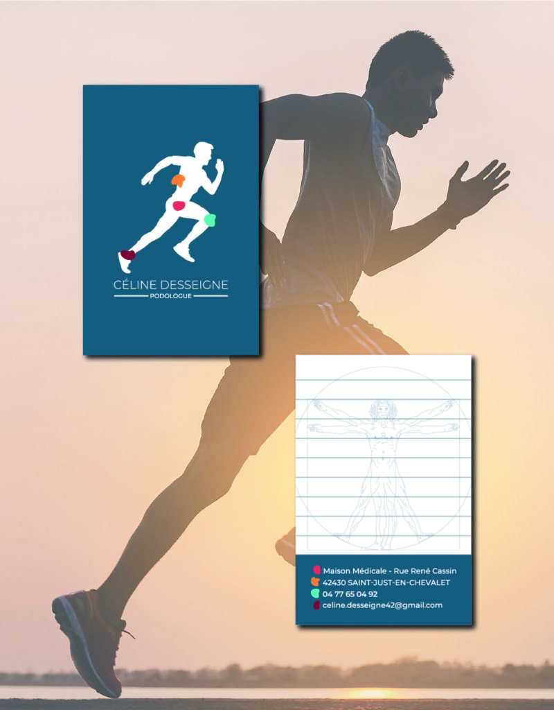 Professionnelle passionnée et engagée, Céline Desseigne accompagne ses patients bien au-delà du soin du pied, avec une approche globale et personnalisée. Pour refléter cette vision moderne et sportive, son identité visuelle a été repensée autour d’un logo en mouvement et en maintenant l’homme de Vitruve, de manière modernisé pour incarner dynamisme et équilibre. La refonte s’est déclinée sur l’ensemble de ses supports : cartes de visite, éléments graphiques, stickers vitrine en verre dépoli, affiches et fiches techniques. Une image claire, cohérente et professionnelle, pensée pour valoriser son expertise et renforcer la confiance de ses patients.