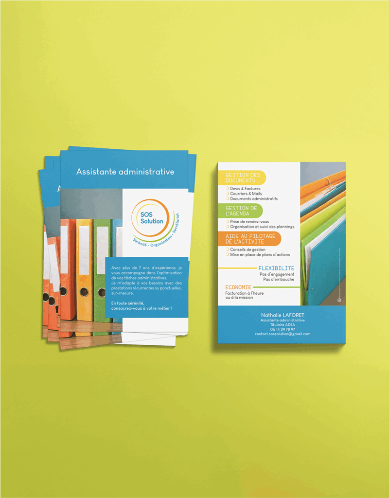 Pour SOS Solution, spécialiste de l’assistance administrative auprès des TPE, PME et artisans, nous avons conçu une identité de marque complète et professionnelle. De la création graphique à l’impression, l’accompagnement a porté sur la réalisation des cartes de visite et d’un flyer clair et impactant, afin de renforcer la visibilité et la crédibilité de l’entreprise. Une identité visuelle simple, efficace et moderne, pensée pour refléter la rigueur et l’efficacité de SOS Solutions auprès de ses clients.